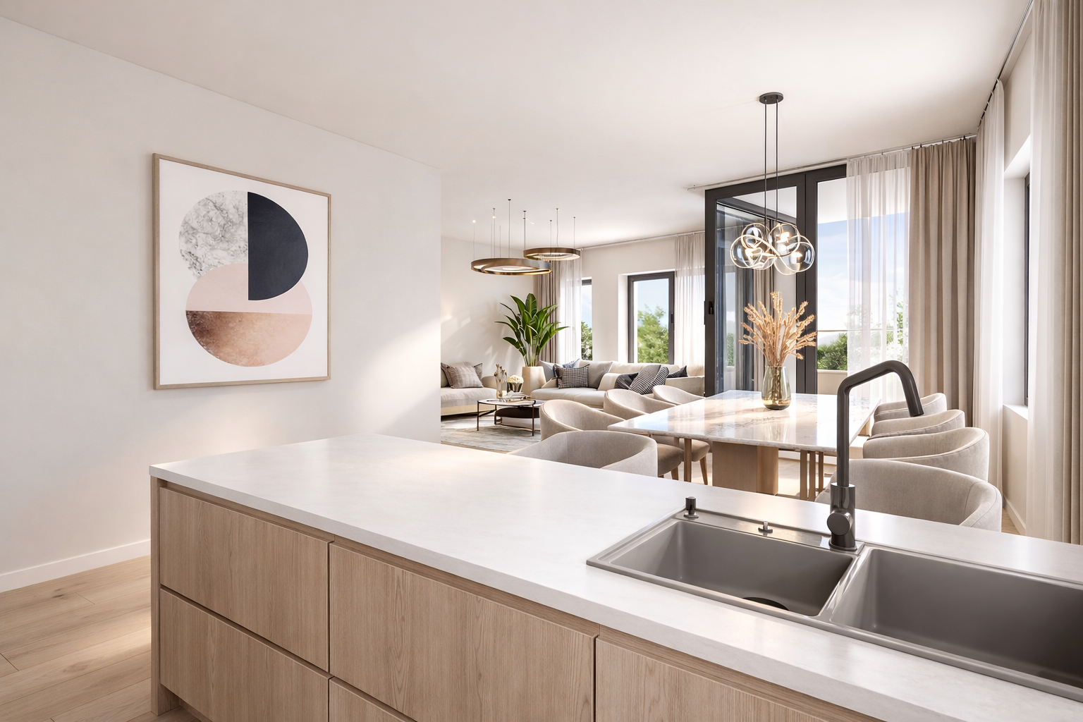 Dit ruime, lichtrijke appartement bevindt zich op de 1ste verdieping. Het beschikt over een praktische inkomhal met een apart toilet, een zeer ruime én lichtrijke overhoekse leefruimte met open keuken met kookeiland en een compact inpandig terras dat de leefruimte visueel vergroot.